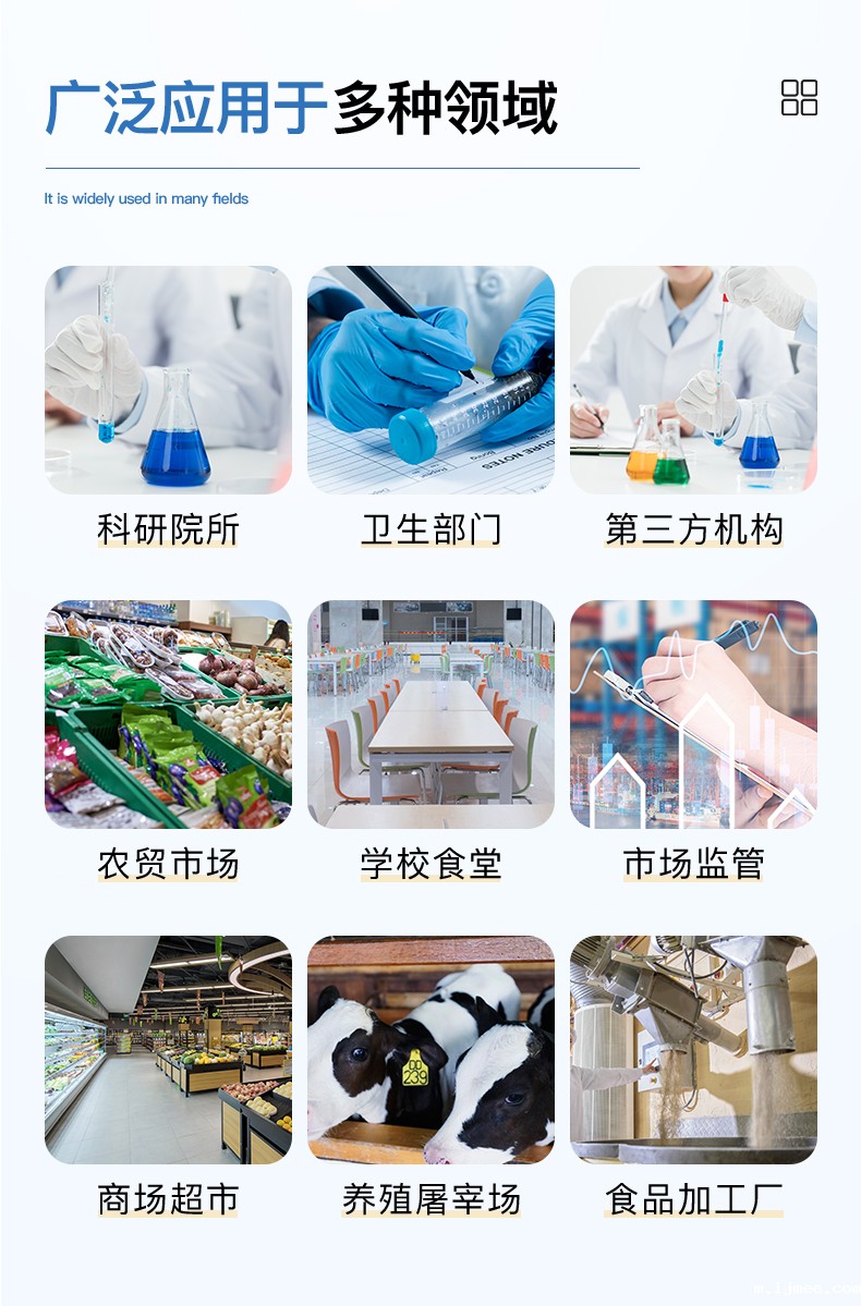 该多功能食品安全检测仪为集成化食品安全快速检测分析设备,广泛应用于食药监局、卫生部门、高教院校、科研院所、农业部门、养殖场、屠宰场、食品肉产品深加工企业、检验检疫部门等单位使用。