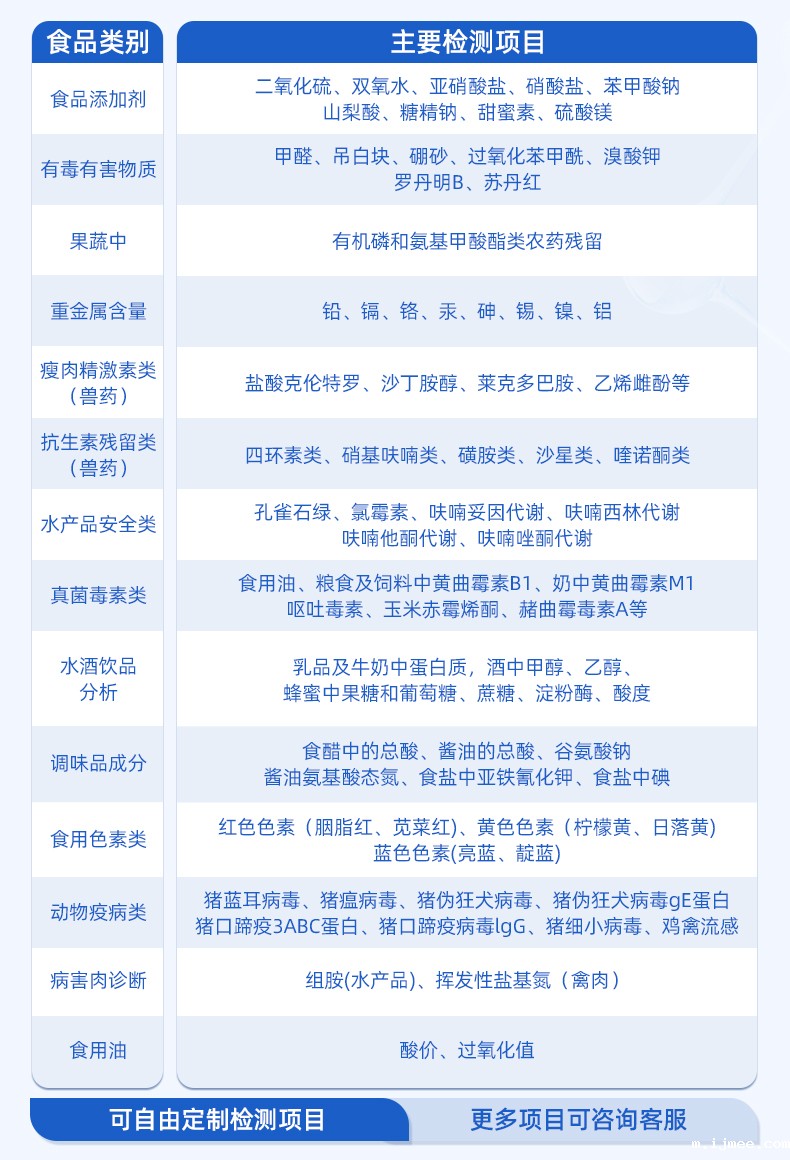 | 食品添加剂:二氧化硫、双氧水、亚硝酸盐、硝酸盐、苯甲酸钠、山梨酸、糖精钠、甜蜜素、安赛蜜、硫酸镁等 | 有毒有害物质:甲醛、吊白块、硼砂、过氧化苯甲酰、溴酸钾、罗丹明B、三聚氰胺、苏丹红等 | 果蔬中:有机磷和氨基甲酸酯类农药残留; | 病害肉诊断:组胺、挥发性盐基氮、肉制品酸价、水发产品中组胺 | 重金属含量:铅、镉、铬、汞、砷、锡、镍、铝等;食用油脂检测:过氧化值、酸价、油脂丙二醛等。 | 瘦肉精激素类(兽药):盐酸克伦特罗、沙丁胺醇、莱克多巴胺、己烯雌酚、喹乙醇等 | 抗生素残留类(兽药):四环素类、硝基呋喃类、磺胺类、沙星类、喹诺酮类、庆大霉素、链霉素、阿莫西林、红霉素等 | 水产品安全类:孔雀石绿、氯霉素、呋喃妥因代谢、呋喃西林代谢、呋喃它酮代谢、呋喃唑酮代谢等 | 真菌毒素类:食用油、粮食及饲料中黄曲霉毒素B1、奶中黄曲霉毒素M1、呕吐毒素、玉米赤霉烯酮、赭曲霉毒素A等 | 水酒饮品分析:乳品及牛奶中蛋白质;酒中甲醇、乙醇、杂醇油;蜂蜜中果糖和葡萄糖、蔗糖、淀粉酶、酸度;水中氰化物、余氯,饮料中维C等 | 调味品成分:食醋的总酸、酱油的总酸、芝麻油纯度、谷氨酸钠、酱油氨基酸态氮、食盐中亚铁氰化钾、食盐中碘等 | 食用色素类:红色色素(胭脂红、苋菜红、赤藓红、诱惑红)、黄色色素(柠檬黄、日落黄)、蓝色色素(亮蓝)等 | 动物疫病类:猪蓝耳病毒、猪瘟病毒、猪伪狂犬病毒、猪伪狂犬病毒gE蛋白、猪口蹄疫3ABC蛋白、猪口蹄疫病毒IgG、猪细小病毒、鸡禽流感等 |