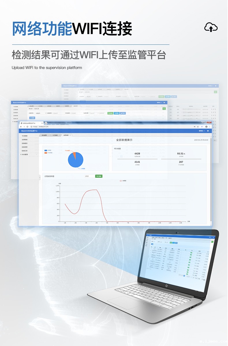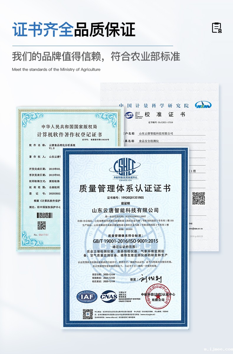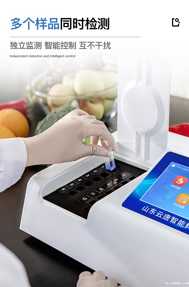 安卓智能操作系统,采用更加**和人性化操作,仪器具有网线连接、wifi联网上传、GPRS无线远传功能,快速上传数据。智能化程度高,仪器具有自检功能:具有开机自检和调零功能,具有自动检测重复性功能。检测通道:≥12个检测通道,可以同时测试多个样品,每个样品由程序控制分别独立工作,不会互相干扰。显示方式:≥8英寸液晶触摸屏显示,人性化中文操作界面,读数直观、简单。配备新一代嵌入式热敏打印机,可选择手动打印或者自动打印,检测完成可自动打印检测报告和二维码。光源采用进口超高亮发光二极管,高精度、稳定性强、光源可控、可以关掉不使用的光源,功耗更低。采用USB2.0接口设计,方便数据的存贮和移动,并可随时与计算机直接相连,并且可用计算机控制仪器。实现数据查询、浏览、分析、统计、打印等。仪器带有监管平台。数据可局域网和互联网数据上传,检测结果直接传至食品安全监管平台。进行区域食品安全监管及大数据分析处理,检测区域食品安全长短期动态,达到食品安全问题预估、预警一体化便携式快检设备,满足现场及流动检测使用需求,能够在同一软件下实现所有检测项目的检测,并可通过同一窗口直观显示检测结果。仪器具有多品类多种类样品菜单库,可灵活选择检测样品,不同的检测通道可同时检测不同的样品项目。也可在仪器上直接编辑录入样品名称、检测指标、送检单位等信息并保存进样品数据库。样品处理简单省力,整体操作快速、安全、便捷。仪器具有自身保护功能,可设置用户名及密码,防止非工作人员操作等。高灵敏度,高检测精度,高重复性精度,扫描式高精度光学传感器。仪器具有重新校准、锁定、恢复出厂设置功能。支持U盘存储。 结果判定线可修改,对照值标定值可保存,断电不丢失数据。