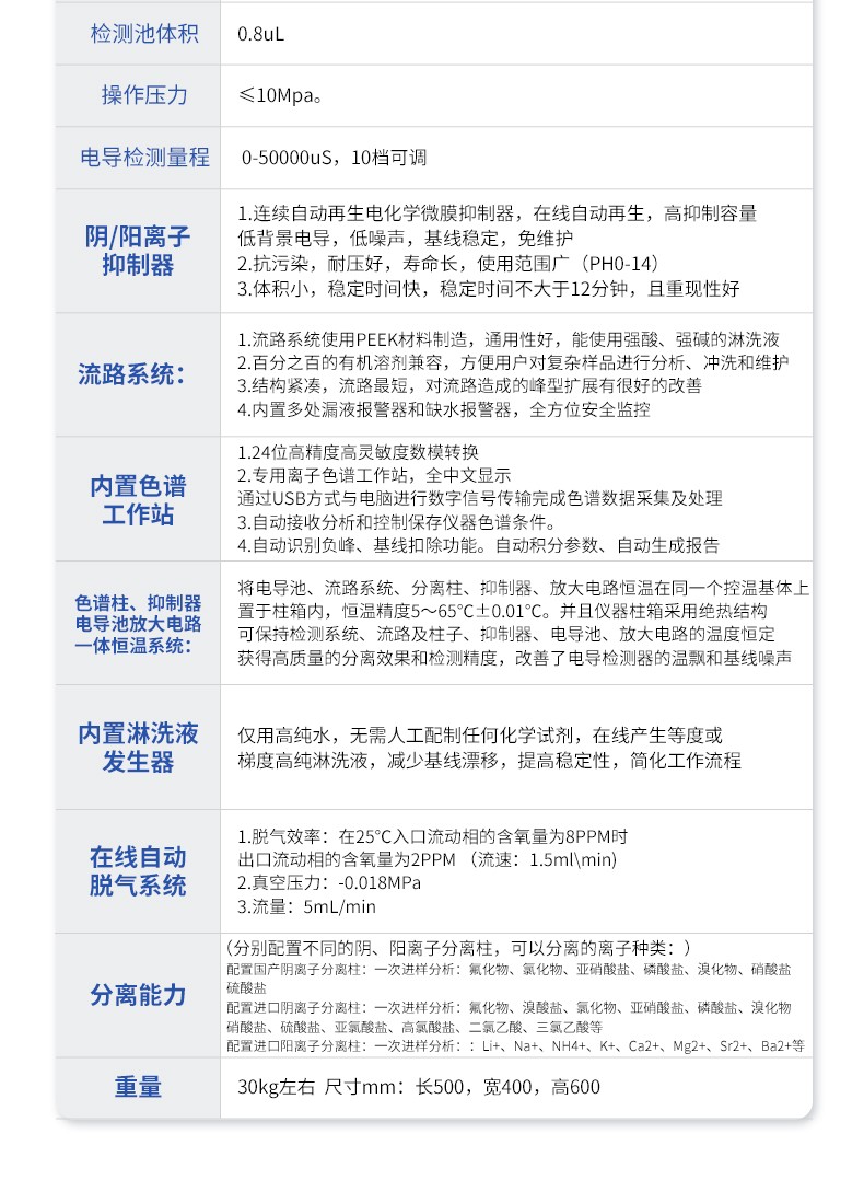 | 我们公司作为离子色谱仪器市场的新业态,一直致力于为用户提供更快捷、优质的仪器,以保障实验室的建设和运行。始终坚持以客户为中心,为有检测需求的客户服务。物美价廉、响应迅捷、服务全面。 | 全新一代离子色谱仪,采用12.1吋纯平工控电脑一体机设计(用户不需要配电脑),实时显示仪器运行参数和状态;一键启动电动阀进样,一键完成仪器开关机、维护等操作,一键调阅仪器操作教程,方便快捷。 | 离子色谱仪核心零部件自主研发、自主知识产权可控。采用一体化设计,集离子色谱主机、淋洗液发生器、工控电脑、色谱工作站于一体,结构紧凑,流路*短,对流路造成的峰型扩展有很好的改善。一体化恒温箱:色谱柱、抑制器、电导池、放大电路都处于同一恒温系统,改善了电导检测器的温飘和基线噪声。内置多处漏液报警器和缺水报警器,全方位安全监控。由PLC控制的各个部件统一到电脑显示屏的集中软件控制系统,操作方便,鼠标所见即所控。 |