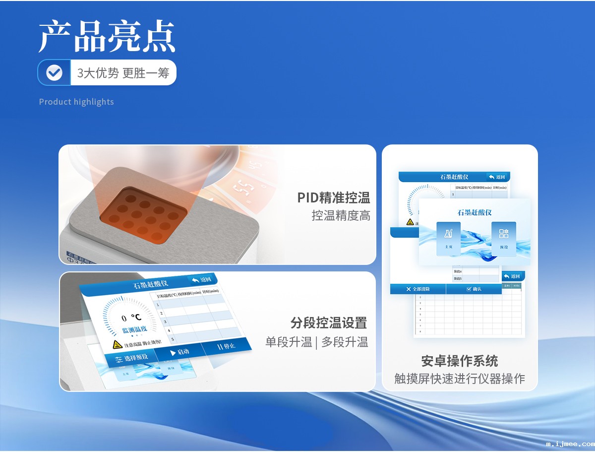 | 使用5寸彩色触摸屏进行仪器操作,配备安卓操作系统,方便快捷。 | 采用PID 控温技术,控温精度高,升温速度快, 从室温到260℃仅需25分钟。 | 分段控温设置,即可单段升温,也可多段升温,设置灵活,仪器将自动按顺序完成。更适于易产生泡沫的样品。 | 采用优质石墨炉内芯,平均温差较小,样品效果一致性好,热传导效率更高。石墨块具有特氟龙涂层,耐腐蚀,延长使用寿命。 |