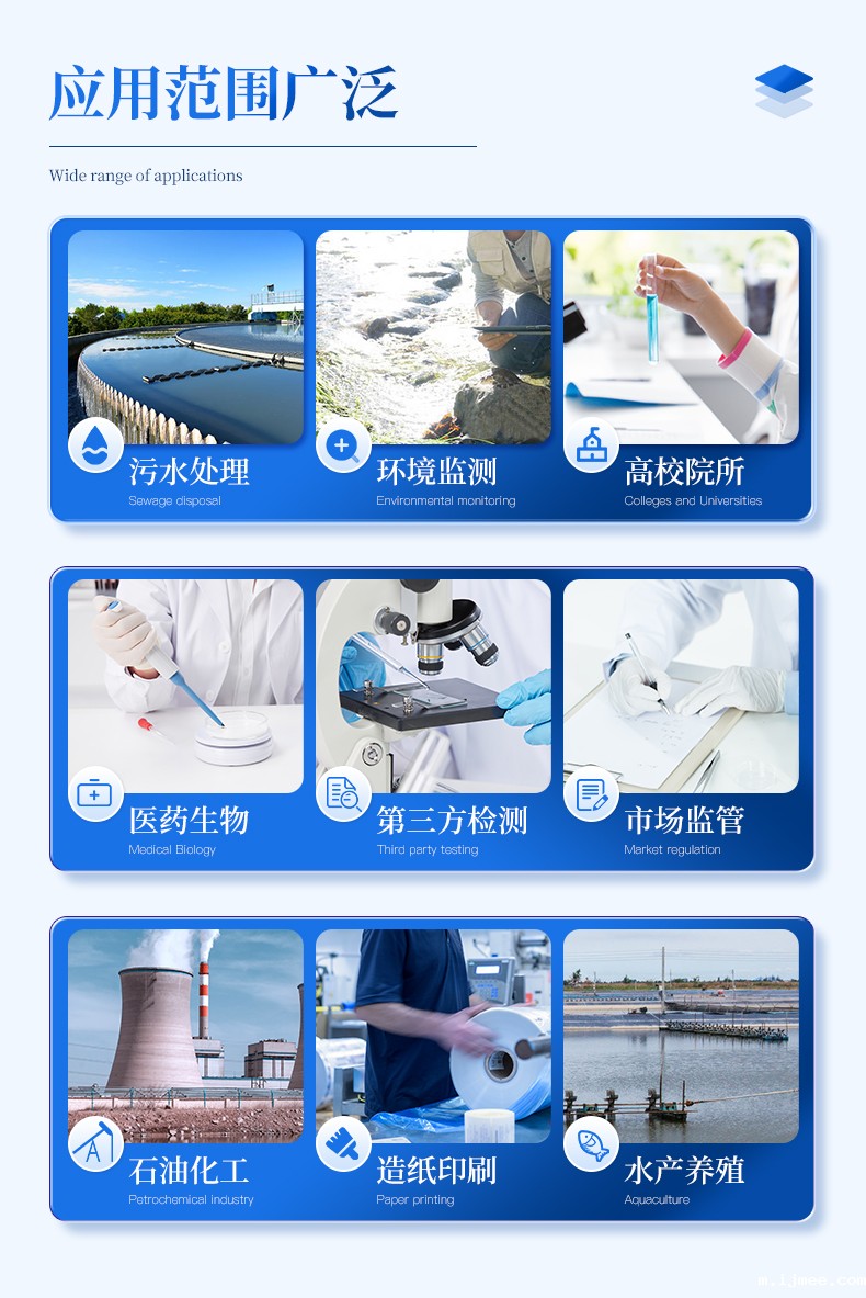 能够广泛的应用于各种行业(工业废水、城市污水、生活污水及江湖流域地表水)废水的检测,可适合不同用户的多种需求,可在化工、石油、焦化、造纸、冶金、酿造、医药等工业废水及各种生活污水监测应用。