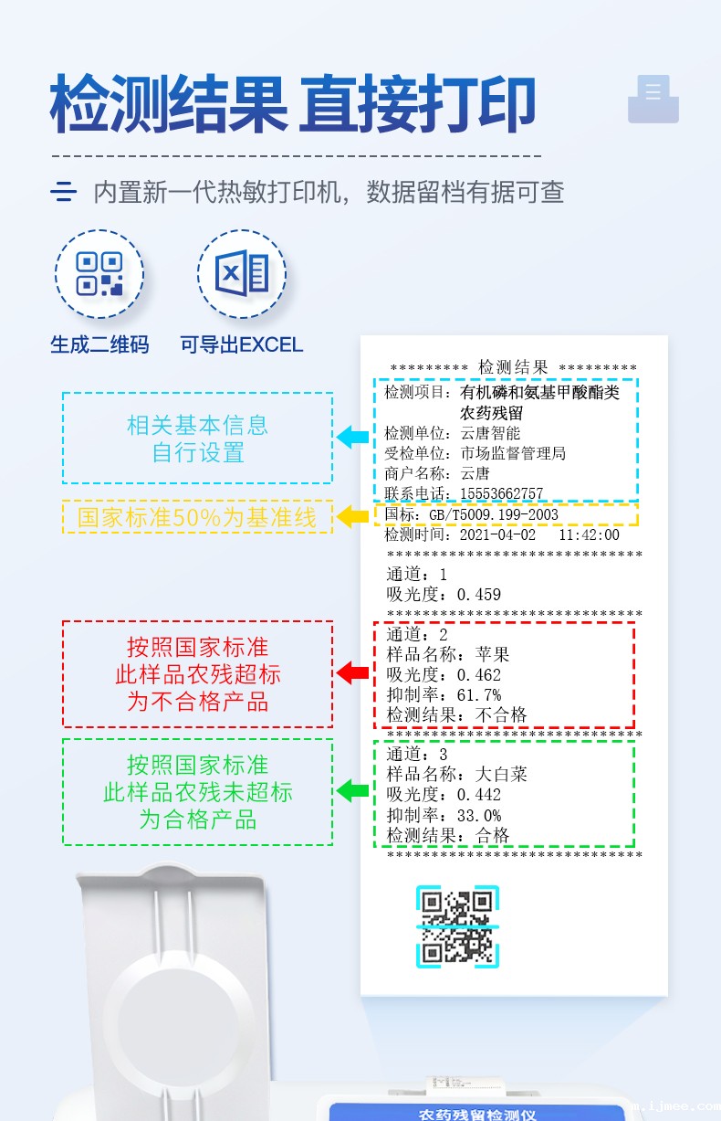 | 乙酰胆碱酯酶和丁酰胆碱酯酶试剂均可以使用,符合国家标准和农业部标准的要求。 | 安卓智能操作系统,采用更加人性化操作,主控采用多核处理器,主频1.88Ghz,运转速度更快速,稳定性更强。 | 仪器具有4G无线远传、wifi联网上传、网线连接功能,快速上传数据,进行数据管理与统计。 | 自动判断样品是否合格,检测结果更加直观。 | 仪器具有100多种蔬菜名称菜单库,分类管理,并可按需添加或删除蔬菜名,编辑蔬菜名称,可直接打印出蔬菜名称。 | 检测通道:10个检测通道,可以同时测试多个样品,循环检测,即放即检,每个样品由程序控制分别独立工作,不会互相干扰。 | 显示方式:7英寸高灵敏真彩触摸屏显示,人性化中文操作界面,读数直观、简单。 | 新一代高速打印机,可同时打印二维码,打印格式为检测人姓名、吸光度差值、检测时间、检测机构、样品名称及结果判定。 | 光源采用进口超高亮发光二极管,具有低功耗、高精度、稳定性强、光源可控可以关掉不使用的光源,响应速度快等优点。 | 智能恒流稳压,光强自动校准,长时间连续工作光源无温漂现象。 | 采用USB2.0接口设计,方便数据的存贮和移动,并可随时与计算机直接相连,并且可用计算机控制仪器。实现数据查询、浏览、分析、统计、打印等。 | 智能化程度高,仪器具有自检功能,具有开机自检和调零功能,具有自动检测重复性功能 | 仪器具有自身保护功能,可设置用户名及密码,防止非工作人员操作等。 | 采用DC12v直流供电,安全系统更高,并且配备6A锂电池充电器。 | 仪器具有重新校准、锁定、恢复出厂设置功能。 |