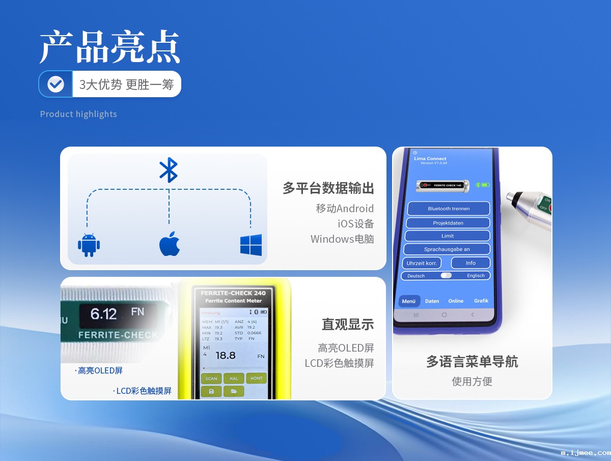铁素体含量检测仪操作简单 List-Magnetik公司 FERRITE-CHECK 140铁素体含量检测仪是一款设计紧凑、使用方便的便携仪器,仪器配有集成探头,仪器符合Basel标准DIN EN ISO 8249,使用磁感应法测量奥氏体钢和双相钢中的铁素体含量。 高亮OLED显示铁素体含量 FERRITE-CHECK 140铁素体含量检测仪只有一个按钮,并配有多语言菜单导航,非常易于使用。高亮度OLED屏显示FN或Fe%的测量结果。 测量焊缝中的铁素体含量 特别是对于焊接的双相钢,重要的是要知道焊缝是否有足够的铁素体含量来保证焊缝的强度。铁素体含量低的话,焊缝受热后较容易产生裂纹,但如果铁素体含量过高,焊缝的韧性和延展性将会丧失。 快速连续铁素体含量测量 使用FERRITE-CHECK 140铁素体含量检测仪,可以非常准确和快速地测定铁素体含量。检测光滑或抛光表面上的焊缝时,可以将仪器切换到快速连续测量模式。当探头放置在表面上并沿表面移动时,测量值将连续存储,在提起探头后,屏幕将显示的*小值、**值和平均值组成的统计信息。 校准铁素体含量检测仪 FERRITE-CHECK 140铁素体含量检测仪配有3个校准标准片,可追溯到NIST 管理和发送测量数据与免费的应用程序 为了进一步处理测量数据,您可以将FERRITE-CHECK 140铁素体含量检测仪与移动Android和iOS设备配对。或者与一台Windows电脑通信。这是由低功耗蓝牙技术(BLE)实现的。使用Lima Connect应用程序,您可以管理项目并在照片上分配测量点。测量结果可以统计评估和图形显示。这款应用适用于安卓、iOS和Windows系统,软件免费的。