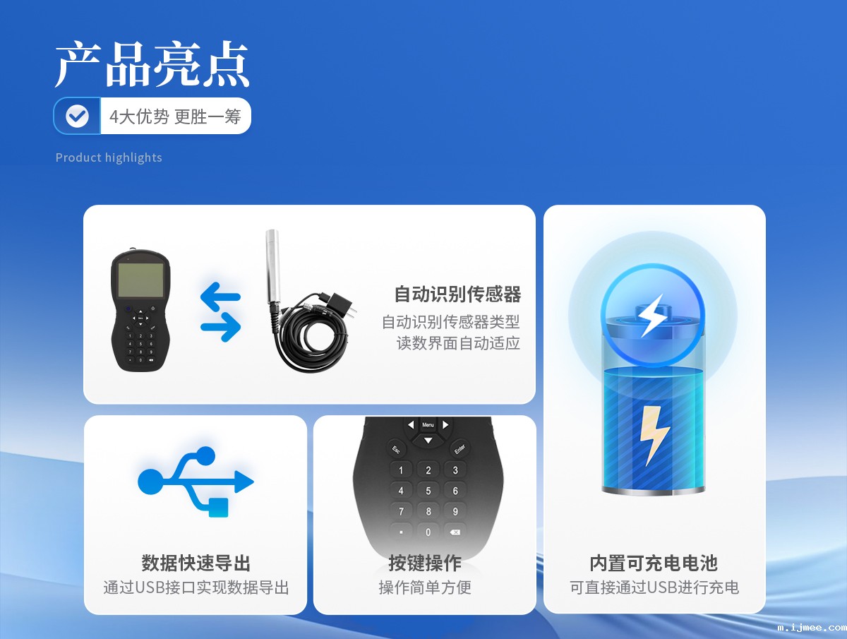 Ø 主机具有IP67防护等级; Ø 3.5寸彩屏显示,界面菜单设计美观,操作简单方便; Ø 人体工程学曲线设计,适于手握握持,带有橡胶防滑手带,在潮湿环境中不易滑落; Ø 具有数据存储功能,且可通过USB接口实现数据导出; Ø 内置可充电电池,且直接通过USB进行充电,无需拆卸电池; Ø 自动识别连接的传感器类型,读数界面自动适应; Ø 可对传感器进行参数设置和校准;