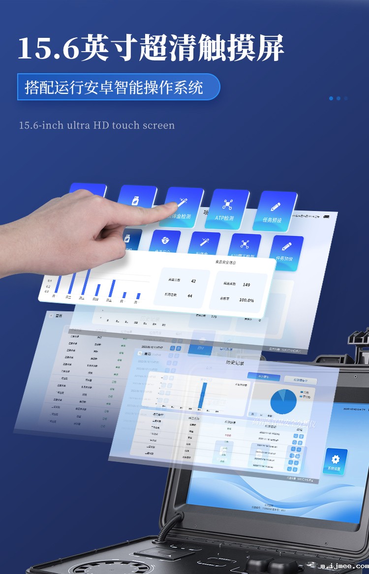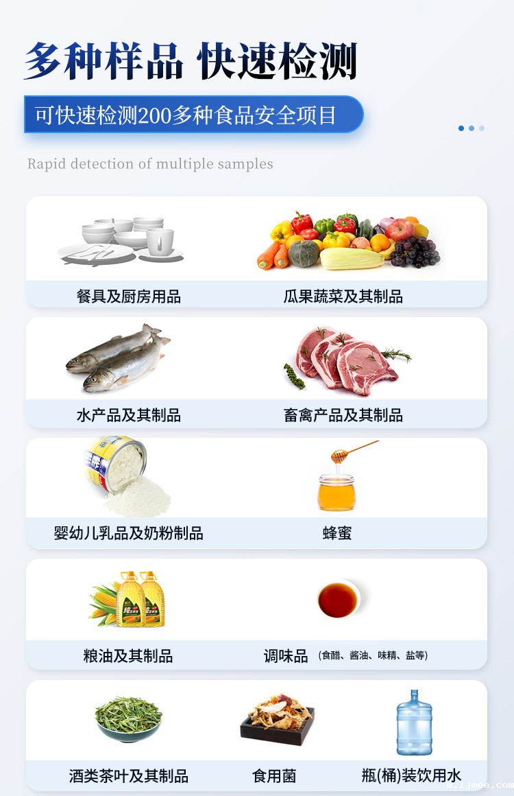 米优app生产的高智能食品安全检测仪为集成化食品安全快速检测分析设备,采用台式一体化设计,可快速检测200多种食品安全项目,包含非食用化学物质、滥用食品添加剂、农药残留、兽药残留、重金属、病害肉、营养强化剂、抗生素类残留、激素类残留、真菌毒素类残留、化学类残留等项目的定性定量检测。