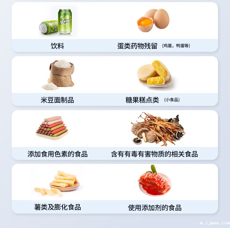 抗生素残留(兽药):四环素类、硝基呋喃类、磺胺类、β-兴奋剂类、沙星类、磺胺类、喹诺酮类,甲砜霉素,氟苯尼考,金刚烷胺、替米考星、庆大霉素、林可霉素、链霉素、恩诺沙星、环丙沙星、头孢啦啶、青霉素、阿莫西林等