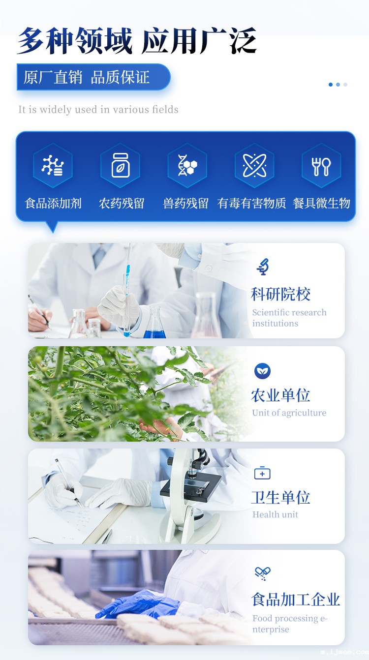 该高智能食品安全检测仪为集成化食品安全快速检测分析设备,目前已于食药监局、卫生部门、高教院校、科研院所、农业部门、养殖场、屠宰场、食品肉产品深加工企业及检验检疫部门等单位广泛使用。