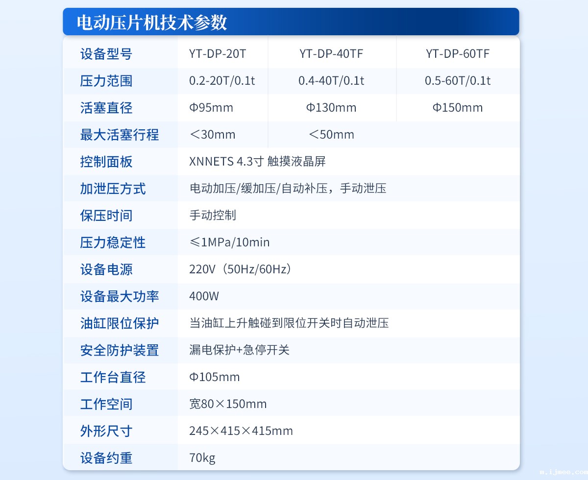 | 设备型号:YT-DP-60TF | 压力范围:0.5-60T/0.1t | 活塞直径:Φ150mm | **活塞行程:<50mm | 控制面板:XNNETS 4.3寸 触摸液晶屏 | 加泄压方式:电动加压/缓加压/自动补压,手动泄压 | 保压时间:手动控制 | 压力稳定性:≤1MPa/10min | 设备电源:220V(50Hz/60Hz) | 设备**功率:400W | 油缸限位保护:当油缸上升触碰到限位开关时自动泄压 | 安全防护装置:防弹玻璃门+漏电保护+急停开关 | 工作台直径:Ф160mm | 工作空间:宽180×200mm | 外形尺寸:405×470×565mm | 设备约重:140kg | 配置说明:压片机1台,模具选配!可根据需求定制压片机或模具 |