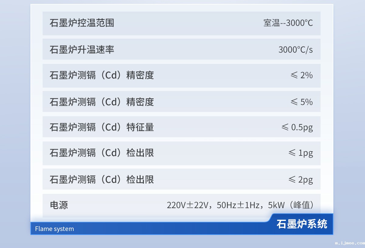 整机单色器类型:切尔尼-特纳型(Czerny-Turner) 波长范围:190nm~900nm 波长准确度:±0.25nm 波长重复性:< 0.05nm 光谱带宽:0.1/0.2/0.4/0.7/1.4 nm 五档自动切换 火焰系统 精密度:< 0.8%(火焰法测铜) 检出限:< 0.008ug/mL 特征浓度:< 0.025μg/ml/1%(火焰法测铜) 静态稳定性: 0.003 Abs(static) 动态稳定性: 0.004 Abs(dynamic) 石墨炉系统 石墨炉控温范围:室温--3000℃ 石墨炉升温速率:3000℃/s 石墨炉测镉(Cd)精密度:≤ 2% 石墨炉测镉(Cd)精密度:≤ 5% 石墨炉测镉(Cd)特征量:≤ 0.5pg 石墨炉测镉(Cd)检出限:≤ 1pg 石墨炉测镉(Cd)检出限:≤ 2pg 电源:220V±22V,50Hz±1Hz,5kW(峰值)